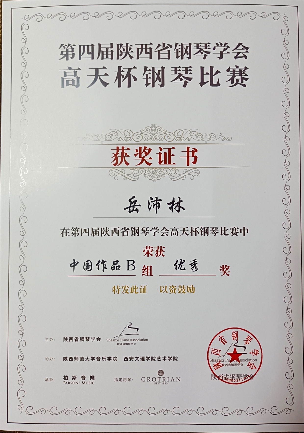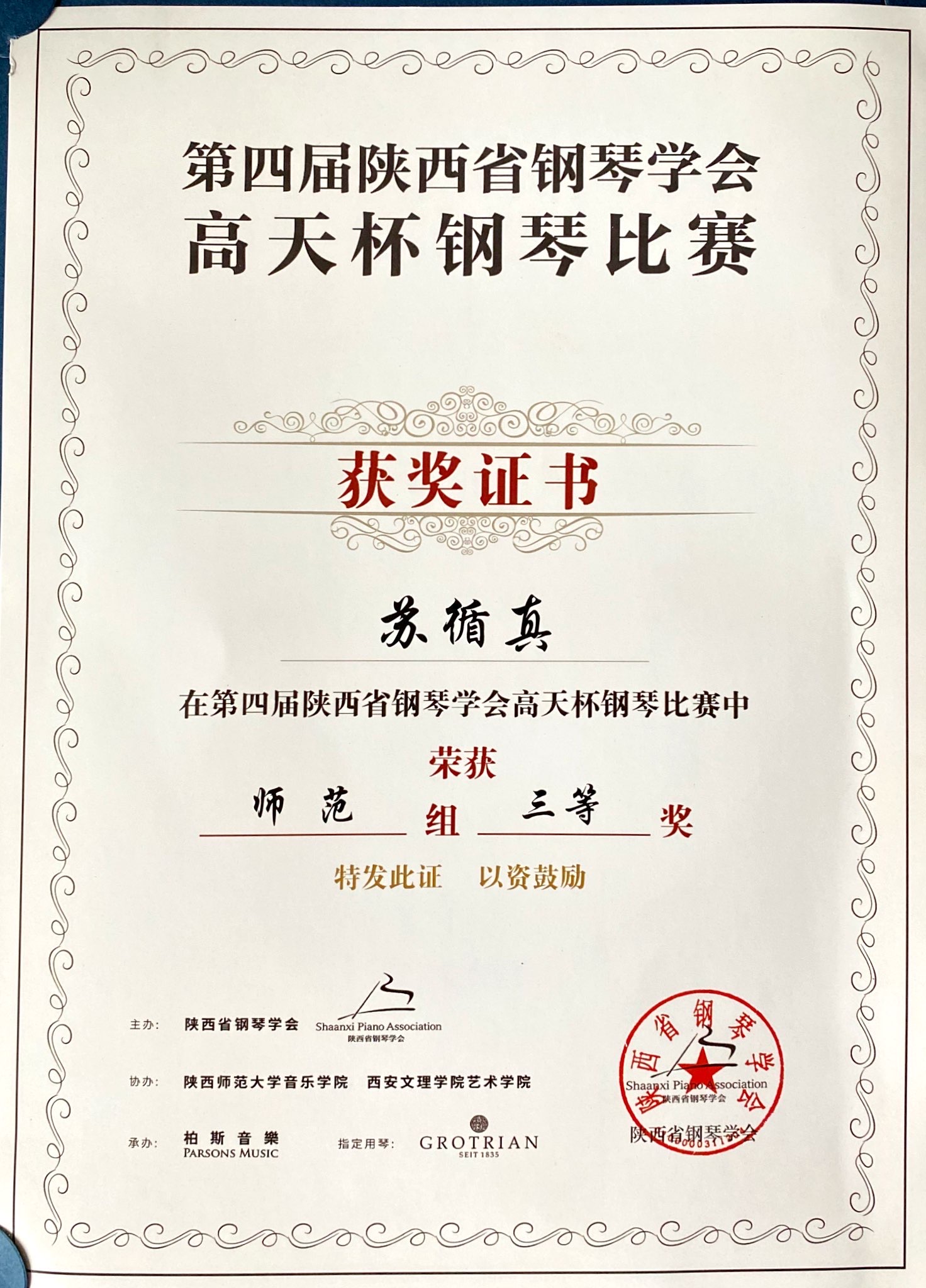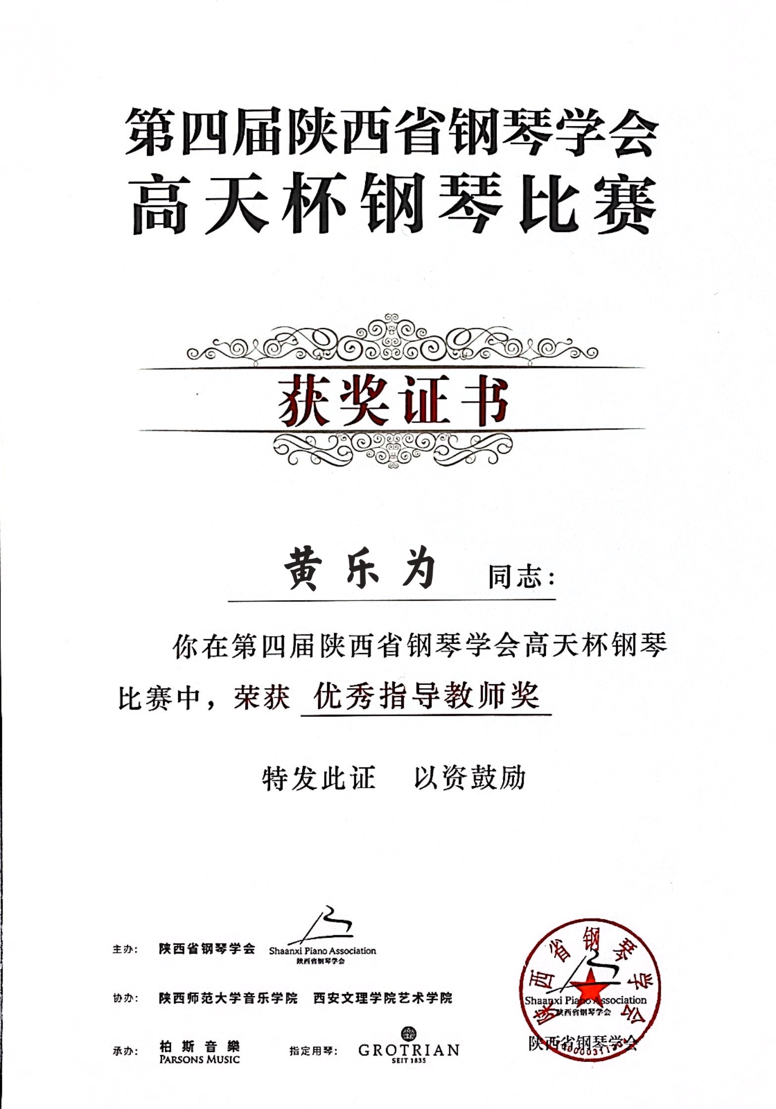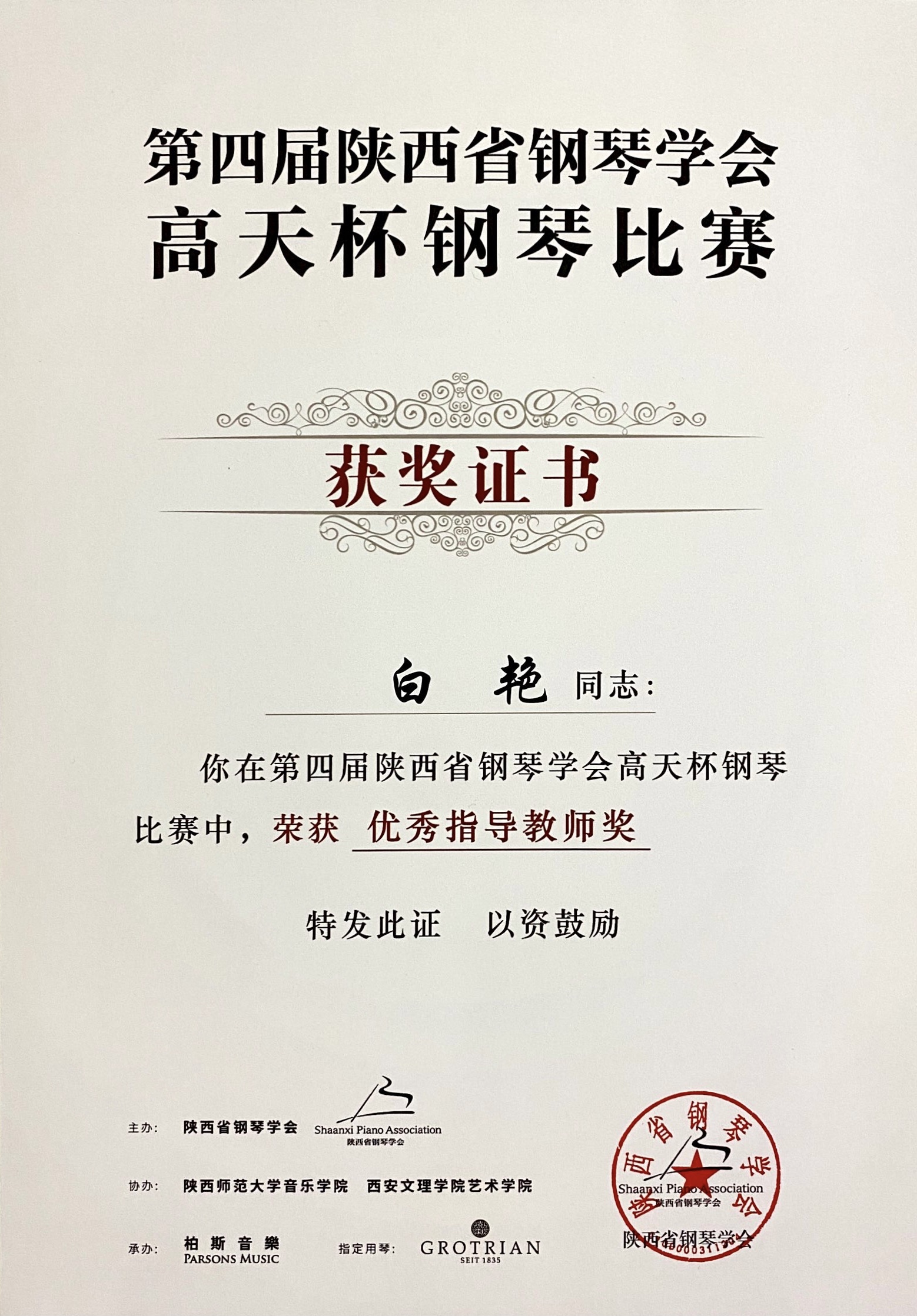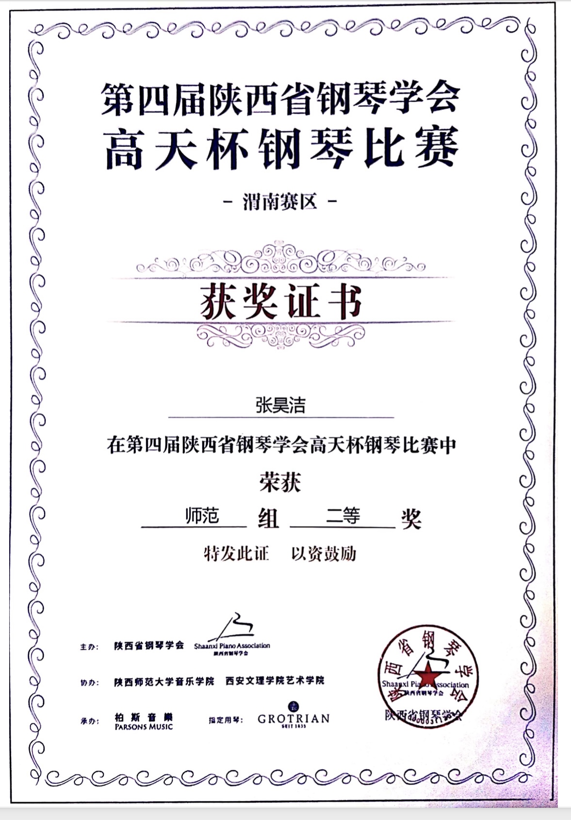 近日,由陕西省教育厅指导、陕西省钢琴学会主办,陕西师范大学、西安文理学院、柏斯集团等单位协办的第四届陕西省钢琴学会“高天杯”钢琴大赛在西安成功举行。经层层选拔,三轮赛制,beat365参赛师生表现优异,最终,2019级音乐学本科张昊洁获得分赛区师范组二等奖,2017级音乐学本科苏循真获得师范组三等奖,2019级音乐学本科岳沛林获得中国作品组优秀奖,指导教师白艳、黄乐为获得优秀指导教师奖。