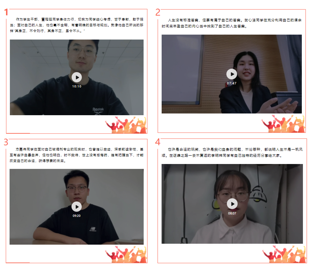 优秀学生代表分别从学习方法、奋斗目标、立志成才、民族团结、热心公益等不同角度与大家共同分享他们的奋斗历程和青春心声。体育学院2018级的董冠廷同学,国家励志奖学金获得者、西安市特殊奥林匹克会优秀参判员,在他的宣讲中,体现了一个青年人对自己、对家庭和对国家的担当;马克思主义学院2018级的贺心洁同学,国家励志奖学金获得者、优秀学生干部,她从书中寻找到了自己人生的航向,遇见了更好的自己;化学化工学院2019级的苏婉旬同学,优秀团员、三好学生,她积极参与志愿服务,燃烧自己,照亮他人;音乐学院2019级的马一塵同学,优秀退役大学生、军训优秀教官,他自军营中百炼成钢,在校园中继续发光发热,为学校的国防事业做出贡献。