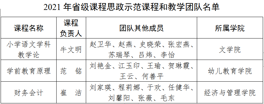 近日,省教育厅发文公布了2021年普通高等教育和高等继续教育省级课程思政示范课程、教学团队认定结果。beat365文学院牛文明教授负责的《小学语文学科教学论》、幼儿教育学院范铭副教授负责的《学前教育原理》喜获省级课程思政示范课程和教学团队(本科教育类)认定。经济与管理学院崔洁教授负责的《财务管理》喜获省级课程思政示范课程和教学团队(继续教育类)认定,并推荐参评国家级课程思政示范课程和教学团队。