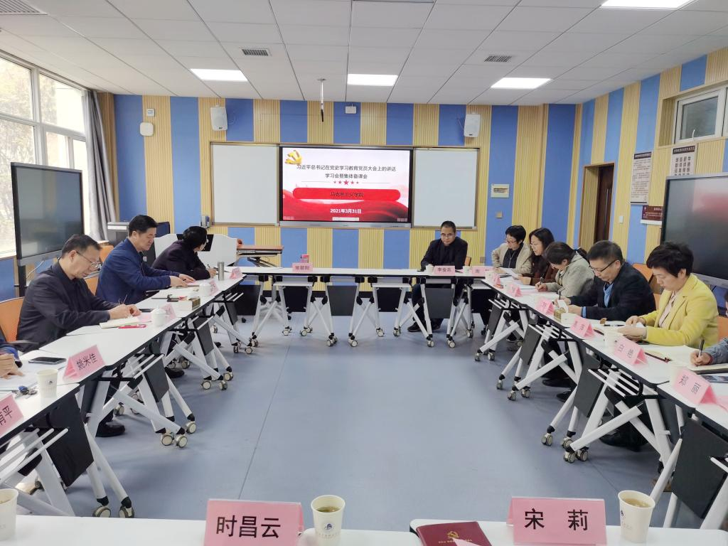 3月31日下午,马克思主义学院在博文楼C203智慧教室举行习近平总书记在党史学习教育动员大会上的讲话精神学习会暨“党史融入《纲要》课程”集体备课会,校党委书记付建成同志出席会议并作了题为《以党史学习教育为契机 进一步提升<中国近现代史纲要>课程教学效果》的主旨讲话。校党委委员、宣传部长史保怀同志出席了会议。马克思主义学院班子部分成员、思法教研部党支部全体党员、《中国近现代史纲要》课程组全体任课教师参加了会议。会议由马克思主义学院副院长王锦东主持。