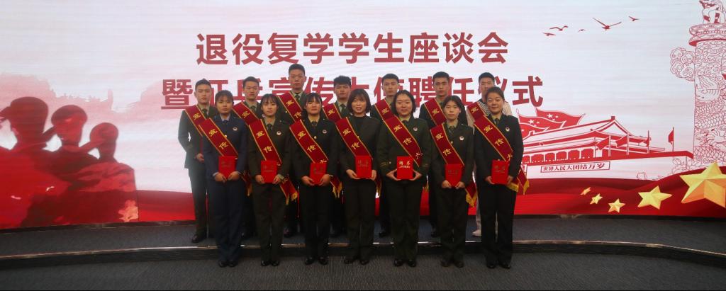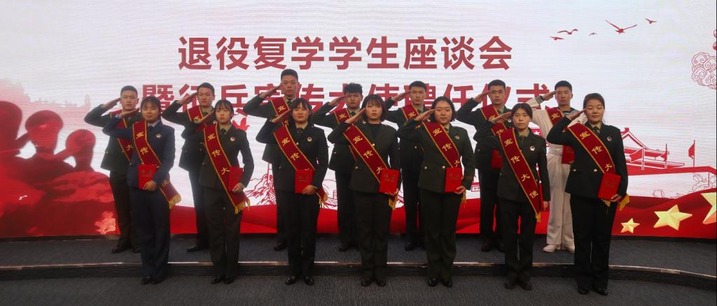 座谈会结束后,栾高明为退役复学学生佩戴征兵宣传大使绶带并颁发聘书。