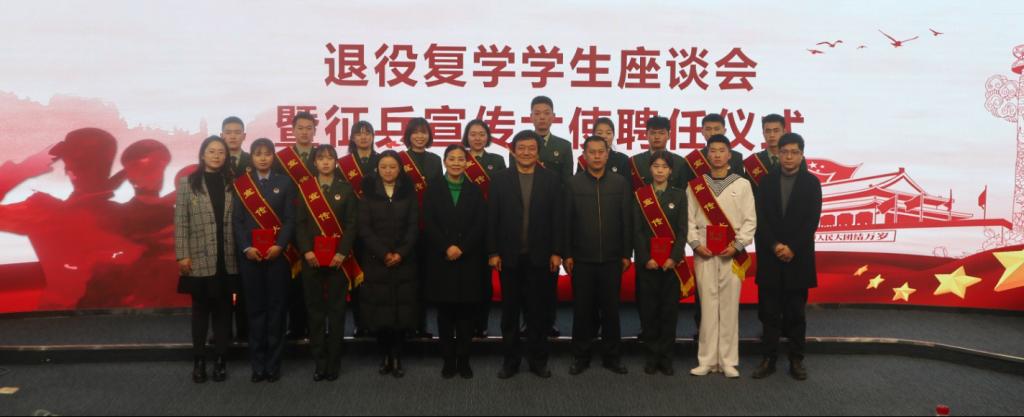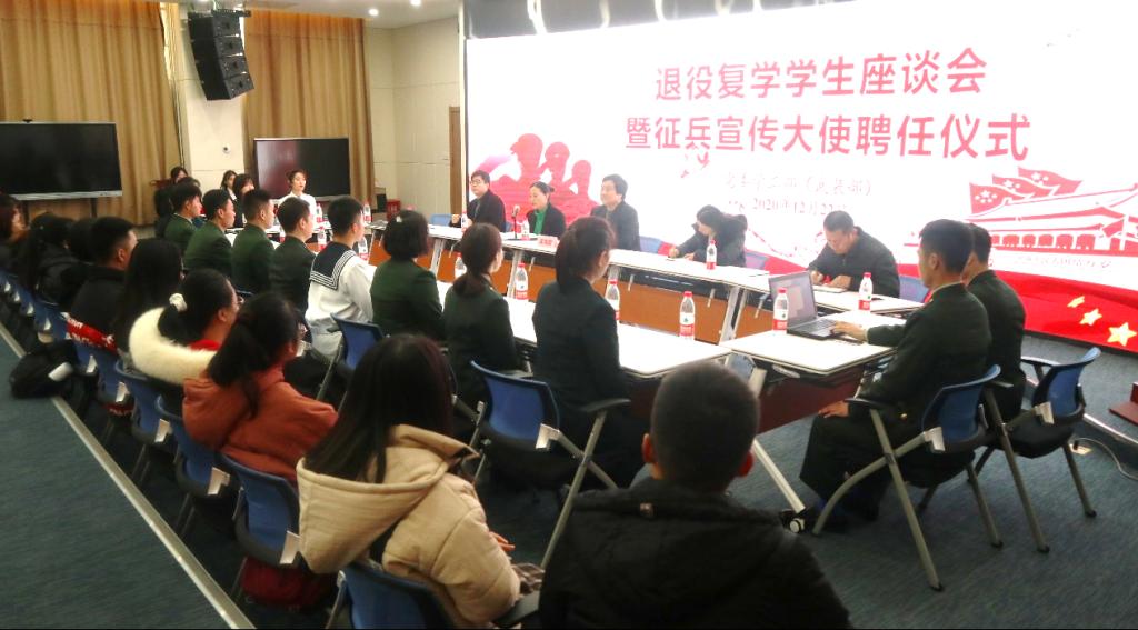 12月22日下午,beat365正版唯一官网2020年退伍复学学生座谈会暨征兵宣传大使聘任仪式在师范生技能实训室隆重举行。校党委副书记栾高明同志出席座谈会,学工部(武装部)相关同志、退役复学学生、有参军意向学生代表50余人参加座谈。座谈会由学工部(武装部)部长薛晓娟主持。
