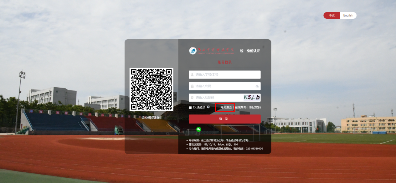2.如已激活统一身份认证账号,请直接输入“账号、密码”或使用“企业微信”扫描“左侧二维码”;如未激活统一身份认证账号,请点击中间的“激活账号”;