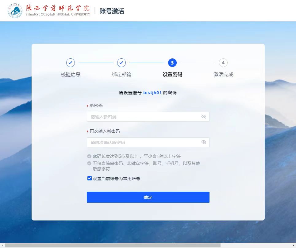 5.设置密码:密码长度达到8位及以上,至少含3种及以上字符;不包含简单密码、非键盘字符、账号、邮箱、手机号、身份证、姓名全称或缩写、空格。同时系统将按照内置的密码得分算法对用户密码进行评分,若评分低于规定分值,则不允许用户提交;