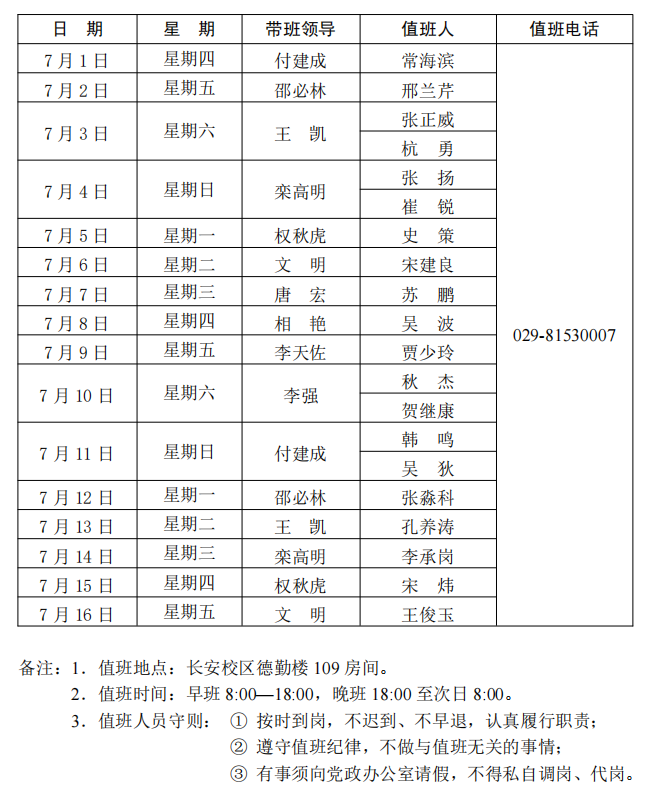 beat365正版唯一官网长安校区值班表(2021年7月1日—7月16日)