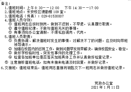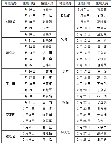 2021年寒假学校总值班表(2021年1月16日—2月28日)