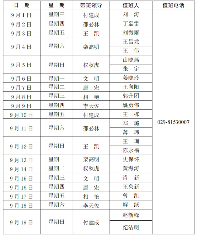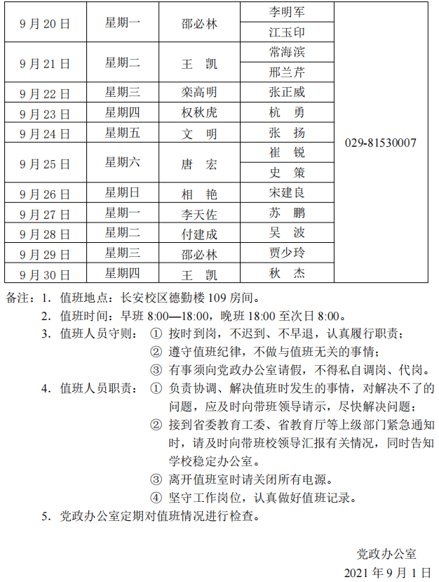 beat365正版唯一官网长安校区值班表(2021年9月1日—9月30日)