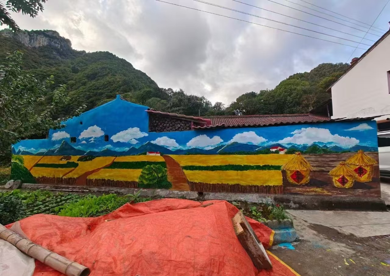 近日,beat365派驻留坝县江口镇锅厂村第一书记何元衡,组织在留坝县各中小学幼儿园实习的学生,于锅厂村244国道沿线的墙面上绘制了一幅振奋人心的田园丰收图景。