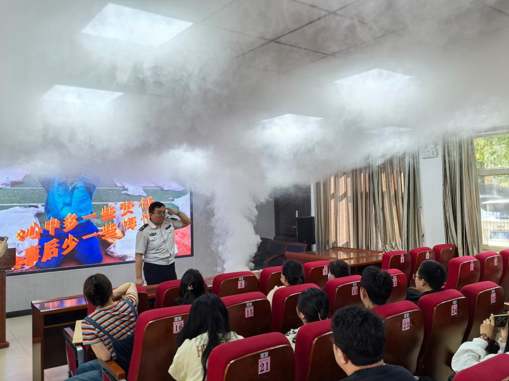 最后,杨教官在操场点燃柴火逐一进行了灭火实战操作。演练现场用干粉灭火器灭火,烟雾缭绕,还原了火灾现场实况,大家亲身体验了身处火场,如何正确逃生及正确使用消防灭火设备扑灭火种、自救互救。