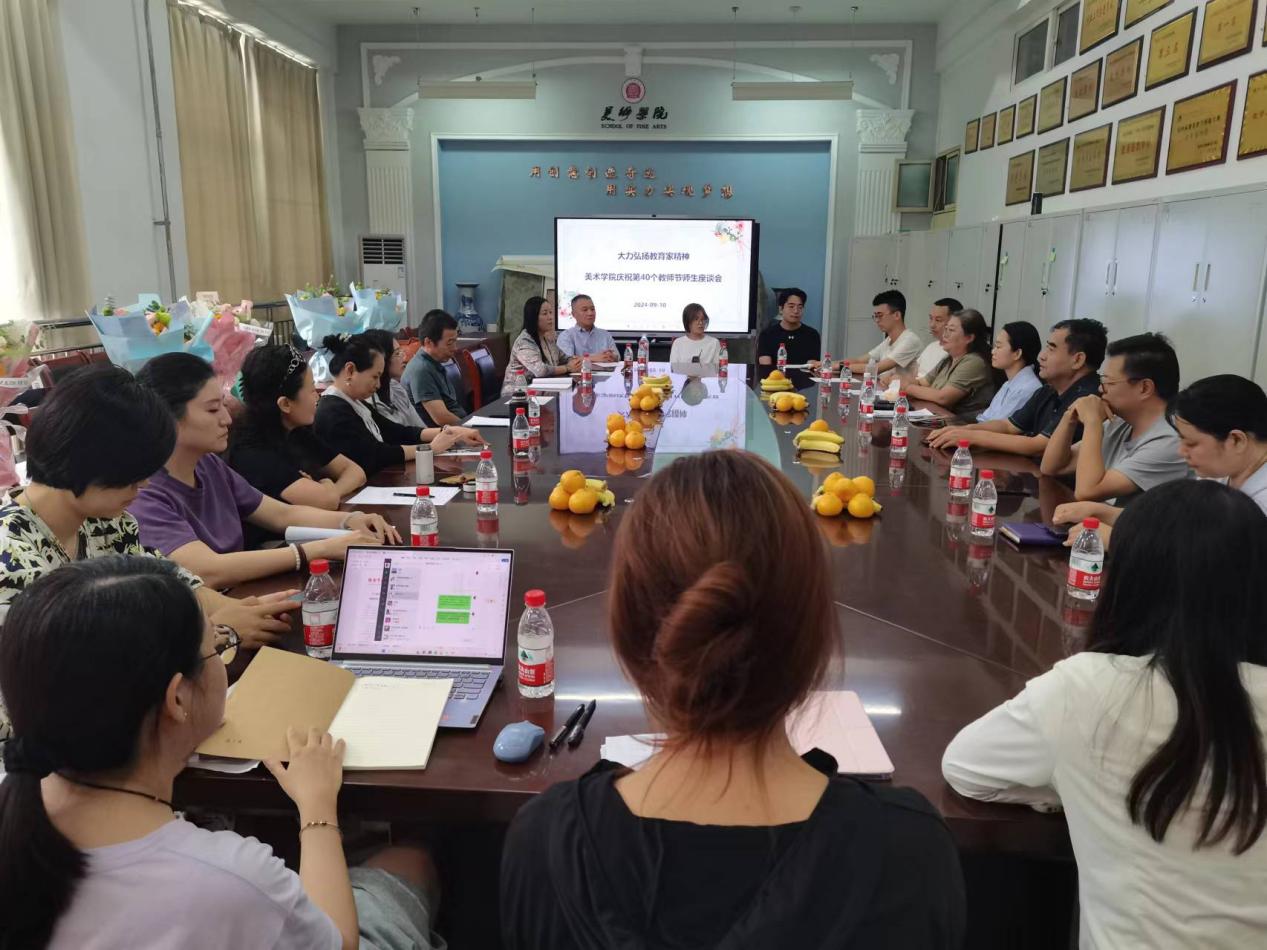 金秋时节,硕果累累。在第40个教师节来临之际,9月10日下午,美术学院在会议室召开“大力弘扬教育家精神 加快建设教育强国”——庆祝第40个教师节师生座谈会,美术学院党政领导出席会议,学院教师代表及学生代表参加会议。会议由院党委书记文竹主持。