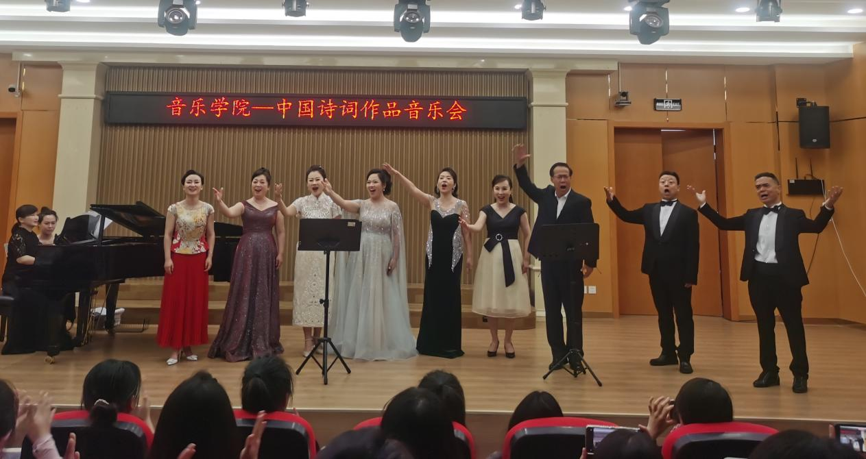 音乐会从诗经《周南·关雎》开篇,声乐教研室十名教师用精湛的演唱技巧、优雅大方又得体的台风,通过不同的音色和演唱风格,将每一首诗词都诠释得淋漓尽致,完美地呈现出诗词中的意境和情感,让观众仿佛置身于诗词的情境之中,一同感受诗词的抑扬顿挫、情感的跌宕起伏。现场观众被教师们的表演深深打动,不时爆发出热烈的掌声和喝彩声。