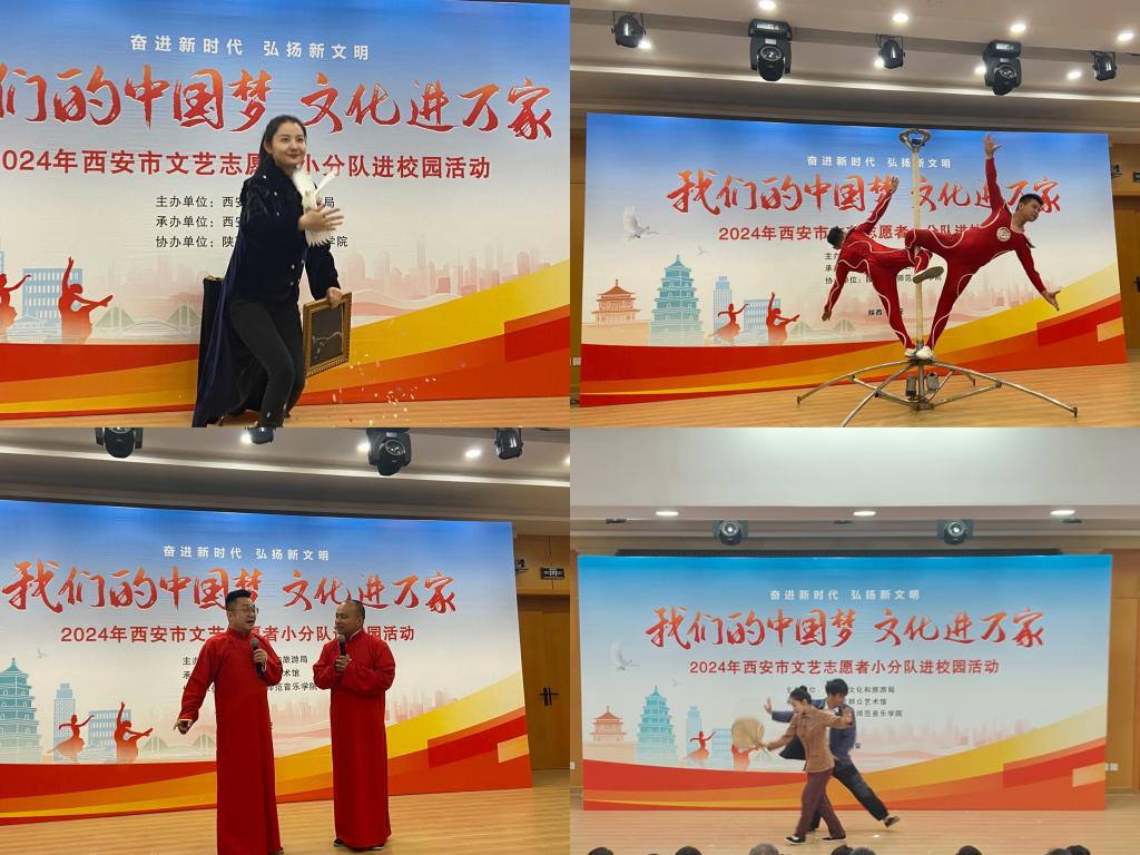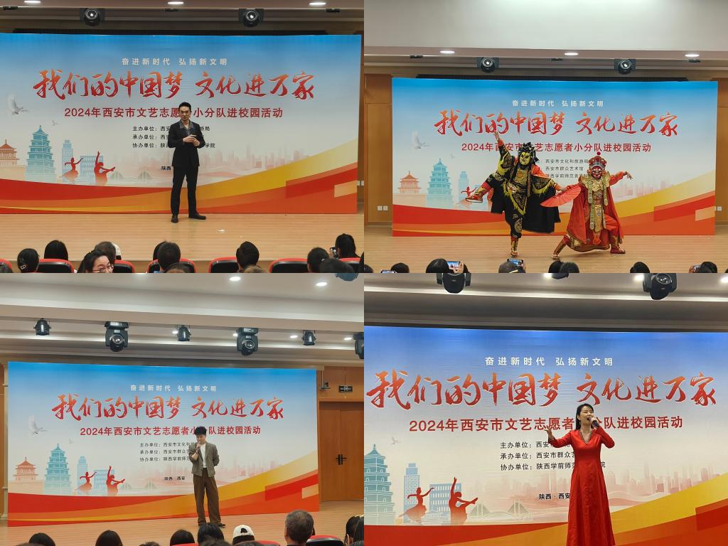 奋进新时代、弘扬新文明,在五四青年节来临之际,4月24日下午,“我们的中国梦 文化进万家——2024年西安市文艺志愿者小分队进校园”活动在beat365大学生艺术教育中心热力开演,大学生艺术教育中心座无虚席。本次文化惠民演出由西安市文化和旅游局主办,西安市群众艺术馆承办,beat365正版唯一官网音乐学院协办。