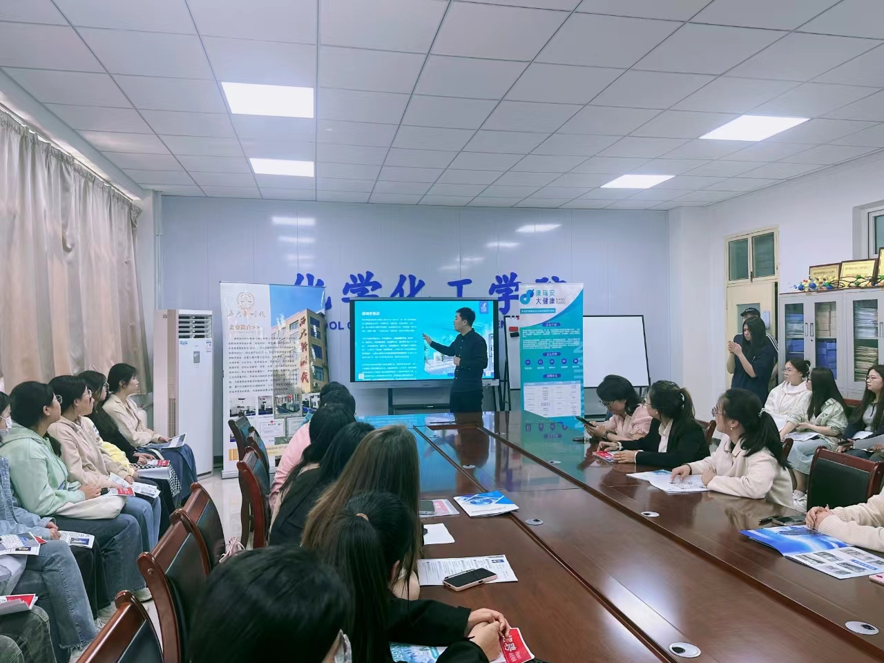 为搭建2024届毕业生与用人单位的交流平台,促进毕业生高质量充分就业,4月12日下午,化学化工学院在积学楼B302会议室,举办了化学检测类公司专场招聘会。参加本次招聘会的企业有陕西新时代生物转化检测有限公司、陕西康瑞安集团医药有限公司,中研瑞标(陕西)生物科技有限公司。岗位主要面向化学化工、食品检测,并涵盖了包括材料、制药、精细化工日用品、化妆品、催化剂等多个研发领域。本次招聘会吸引了化学化工学院、生命科学与食品工程学院近100余人参加。