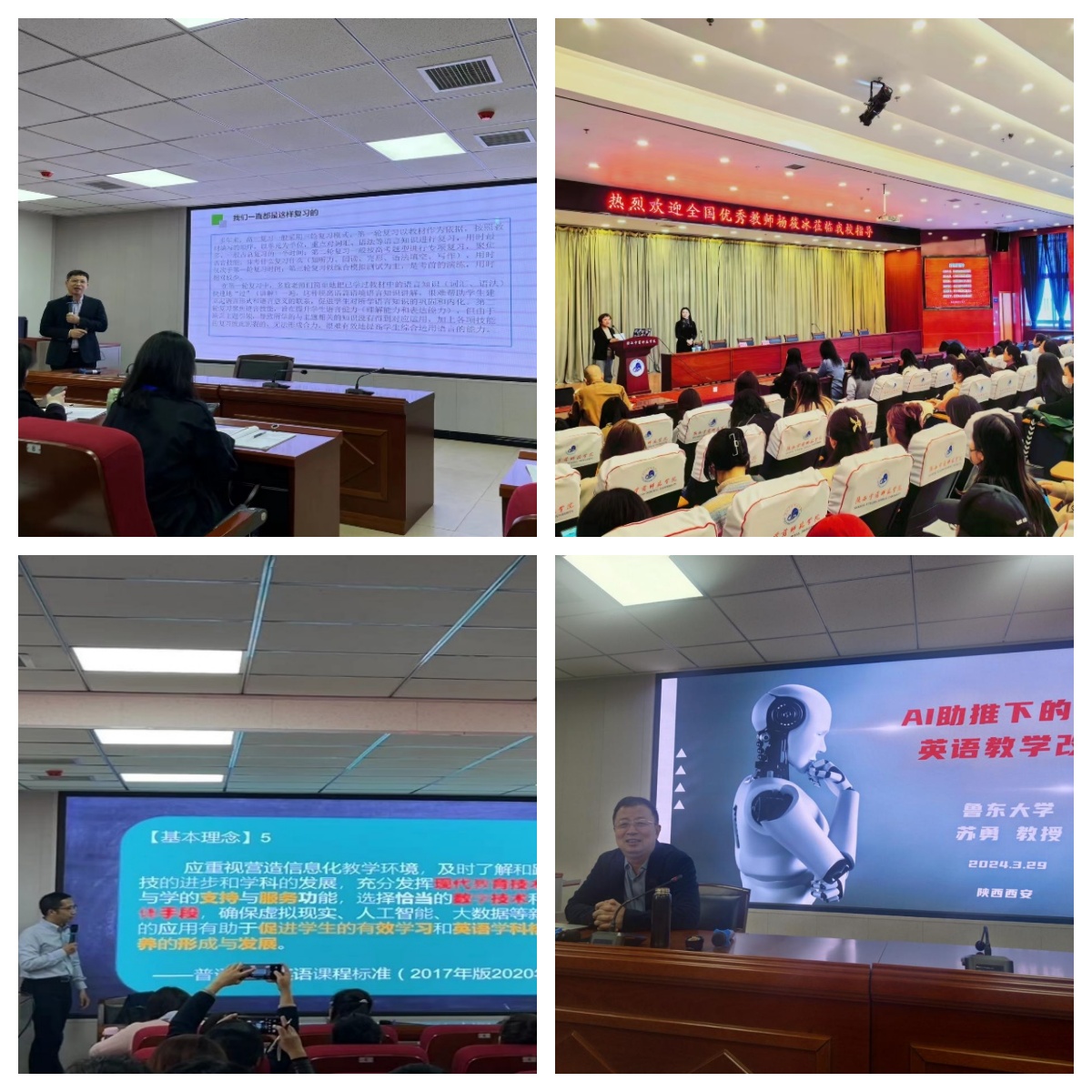 本次培训邀请了来自国内多位业内专家与优秀教师进行了精彩授课。海南省教育研究院卓俊斌教授分享了“基于语境的高三英语复习大单元教学实践与探索”,为教师们提供了高三复习备考的新视角。卓教授在讲座中强调了语境化教学在高中英语复习中的重要性,他认为通过将语言学习置于真实或模拟的语境中,可以大大提高学生的语言运用能力和理解力;杨筱冰老师作为西安市二十六中的资深高级英语教师、陕西省特级教师,以及国家级骨干培训者,她的教育生涯凝聚了对教育的深厚情感和无尽的热忱。她的报告《做太阳底下最幸福的事业》不仅分享了她41年教书育人的经历,更深入探讨了如何在英语教学中实现教育家精神的传承与发扬;西安教科院教研员王兰英老师深入浅出地讲解了中学英语教学评一体化的教学设计及实践,提高了教师们对教学评价的认识。王兰英老师在讲座中强调,教学评价一体化是当前英语教学改革的重要方向,它要求教师在教学过程中融入各种形式的评价,通过评价促进学生的学习,同时也反馈教学效果,指导教学调整;山东鲁东大学的苏勇教授以其深厚的学术背景和前瞻性的视角,为教师们带来了题为“人工智能引领下的高中英语教学变革”的精彩讲座。苏教授首先概述了人工智能技术的发展背景及其在教育领域的应用前景,随后深入探讨了人工智能如何在高中英语教学中发挥作用,包括个性化学习路径的设计、智能教学资源的开发使用以及学习评价的智能化处理。