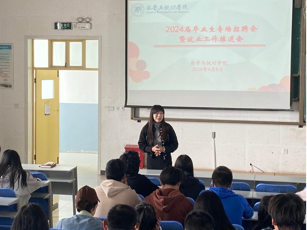 为切实做好2024届毕业生高质量就业工作,扩展就业岗位,抢抓毕业生求职关键期,4月8日,数学与统计学院在积学楼C4阶梯教室召开了2024届毕业生专场招聘宣讲会暨就业工作推进会。学院特邀上海长宁区乐读线上教育培训学校西北地区选聘顾问宋雪莹、侯哲雄两位老师为学生宣讲。学院领导、毕业班辅导员及未落实就业的毕业生参加活动。