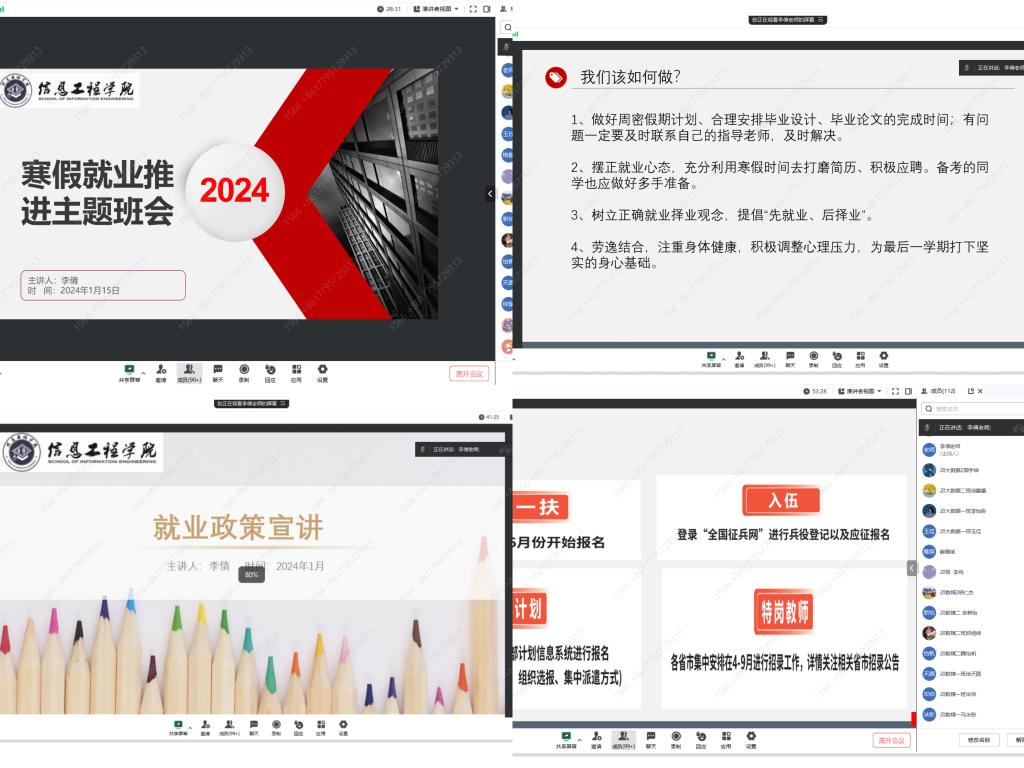寒假期间,毕业班辅导员利用线上会议平台召开了“毕业生寒假就业动员主题班会”,积极动员毕业生充分利用寒假窗口期进行求职就业,并持续为毕业生提供就业方向选择、简历修改建议、面试技巧等各方面的求职就业指导,帮助毕业生解决实际困难,缓解就业心理焦虑。