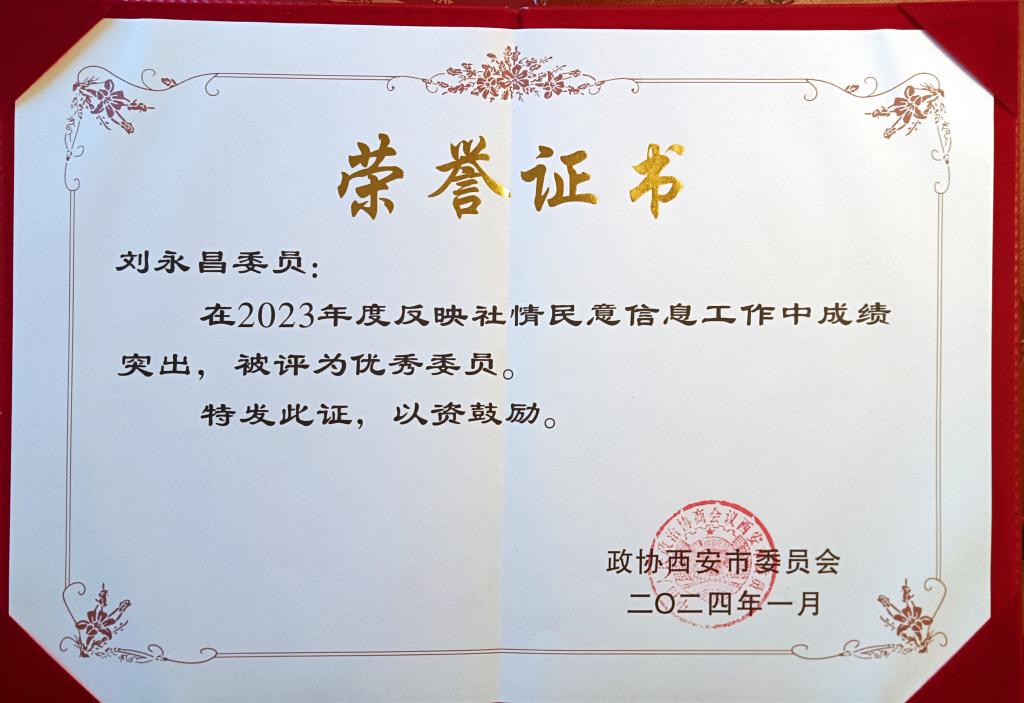 近日收到喜讯,在2月1日起召开的政协西安市第十五届委员会第三次会议总结表彰中,beat365民革党员、民革莲湖区支援支部副主委、西安市政协委员刘永昌副教授在2023年度反映社情民意信息工作中成绩突出,被评选为“优秀委员”,为beat365统战工作再立新功,在此表示热烈祝贺,号召全校广大统一战线成员向刘老师学习!
