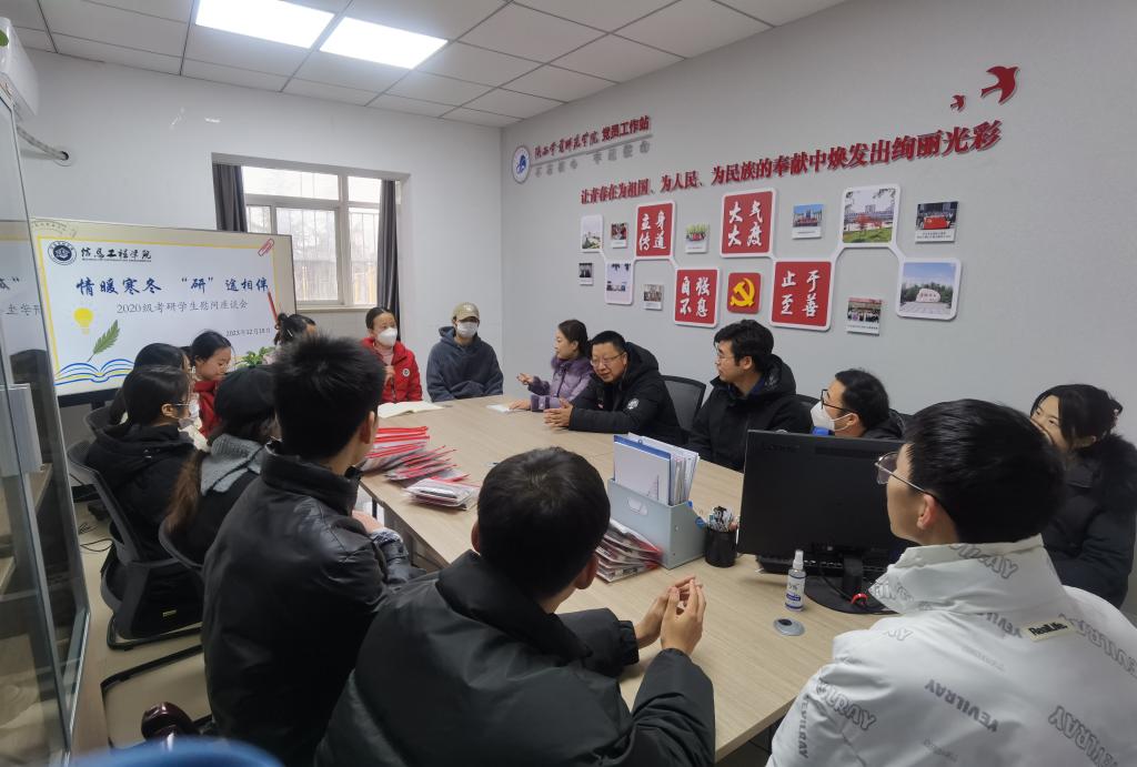2024年全国硕士研究生招生考试在即,为帮助我院2020级考研学生缓解备考压力,鼓舞考研士气,同时进一步推动学院“一站式”学生社区文化内涵建设和促进学院学风建设,信息工程学院于2023年12月19日下午16:30在9号学生公寓党员工作站召开2020级考研学子慰问座谈会。学院院长、副院长、党委副书记、教师代表、学工办主任以及2020级考研学生代表参加了此次座谈会,大家围坐一席,友好畅谈。