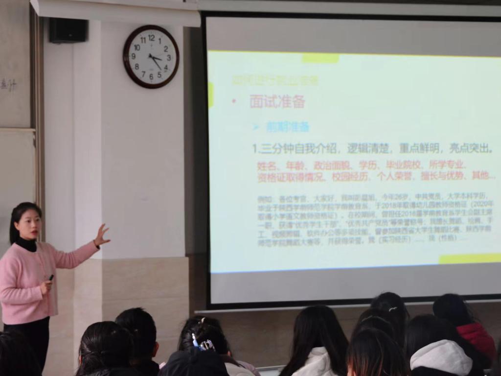现就职于西安高新区第十二幼儿园的2014级毕业生彭晨旭,从分享自身的榜样,一位从只有高中学历通过不断拼搏,最终成为谷歌公司程序员的励志女生孙玲的故事开始,向同学们传递充满正能量的就业观和价值观。此外,她结合自己目前的工作岗位,给学弟学妹们详细讲解了如何制作一份清晰明了、重点突出的求职简历,包括面试的技巧和方法。