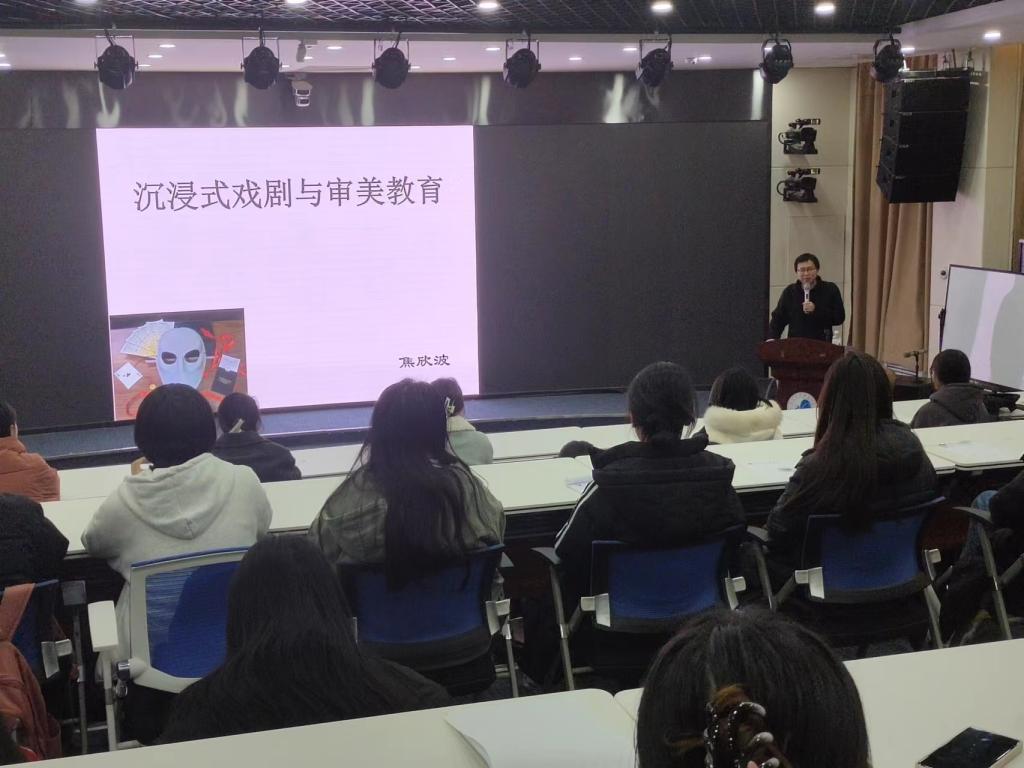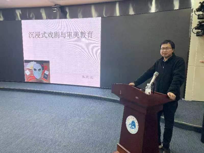 西北大学文学院博士生导师焦欣波教授应邀做“沉浸式戏剧与审美教育”专题报告。焦欣波教授梳理了“沉浸式戏剧”的发展脉络,分析了其创新之处:以观众为核心,在观演关系观众由旁观者变为创造者;形式的创新与变革赋予戏剧新的活力,环境空间为沉浸式戏剧提供基础,沉浸体验则促成沉浸式戏剧的形成。焦欣波教授指出,“去中心化”叙事手段、预设性情节、沉浸式体验为青少年追寻诗和远方提供途径,这正是沉浸式戏剧的审美意义。焦欣波教授最后指出“沉浸式戏剧”的不足之处:剧本的弱化,难免落入强游戏性的窠臼;过度商业化,导致观演展陈化与景观化。焦欣波教授最后与现场师生热情互动,他表示,任何文学作品只有契合时代才能沉淀为经典。他鼓励在师生,在时代大潮中,不断提升自我,方能赢得未来。