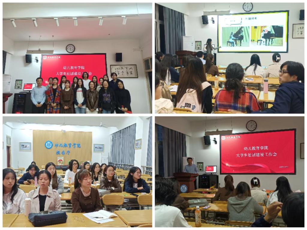 幼儿教育学院现有校级学生社团5个,分别为学前社、绘本戏剧社、灵犀刀笔油画协会、引路者协会、师院有声传媒协会。会上,五个社团的学生负责人依次介绍了各自社团的基本情况,总结了社团在2022-2023学年的工作情况,对新学年学生社团工作计划进行了详细介绍,也指出了各社团在工作开展中存在问题已及改进措施。
