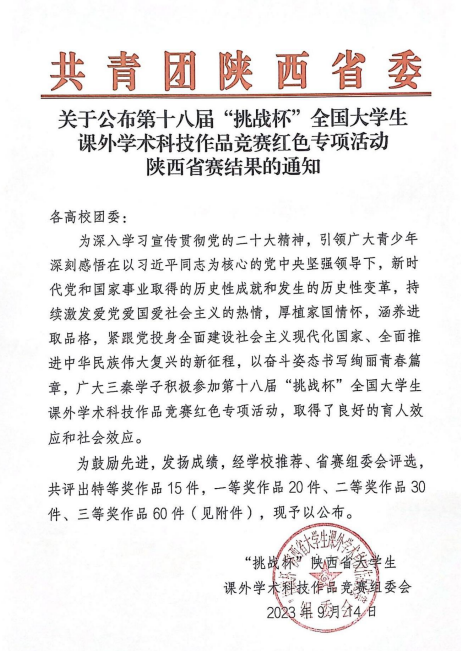 传承红色基因,缅怀革命先烈。积极参与第十八届“挑战杯”全国大学生课外学术科技作品竞赛红色专项活动,是陕师院学子接受思想洗礼,坚定理想信念,传承红色文化的重要体现。学校和学院将继续做好以“挑战杯”竞赛为龙头的创新创业赛事组织工作,持续强化实践育人的引领力、组织力、服务力,不断教育引导广大青年为强国建设、民族复兴新征程中贡献青春智慧和力量。