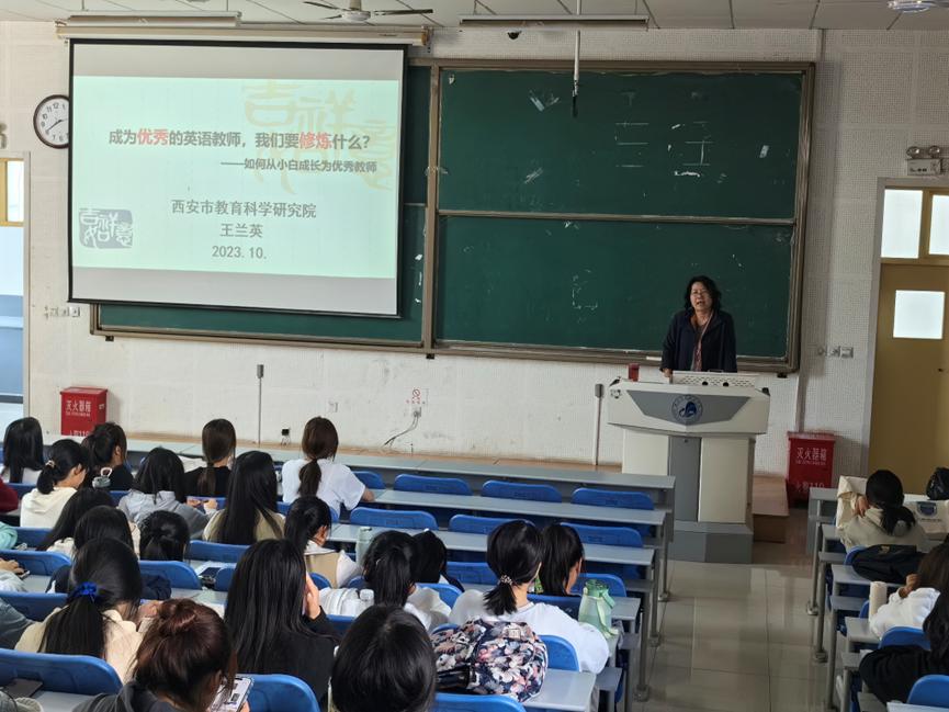 2023年10月30日下午,外国语学院邀请西安市教育科学研究院王兰英老师做客第十八期“英华名师讲堂”,为英语系2023级新生进行了一场题为“成为优秀的英语教师,我们要修炼什么?——如何从小白成长为优秀教师”的讲座。外国语学院张慧军院长、英语系主任刘少杰博士和英语专业2023级全体学生参加了本次讲座。