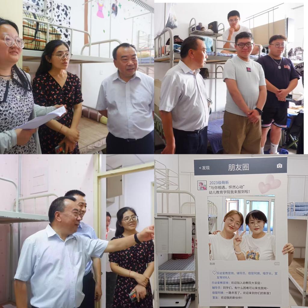 2023年9月7日16:30,幼儿教育学院院长何善平、党委副书记(主持工作)王继康、党委副书记苏群、学工办主任程旭楠、新生辅导员白雪祺一同前往宿舍楼看望新生,与五湖四海的同学们亲切交谈,了解新生适应情况、用餐习俗、住宿、未来规划等情况,同时仔细查看宿舍基础设施,进行隐患排查,强调宿舍安全、防范诈骗等具体事项,嘱咐同学们遵守校纪校规,鼓励同学们养成良好的生活习惯、卫生习惯、学习习惯,保持积极向上的劲头,在幼儿教育学院的温暖怀抱中充分展现自我。