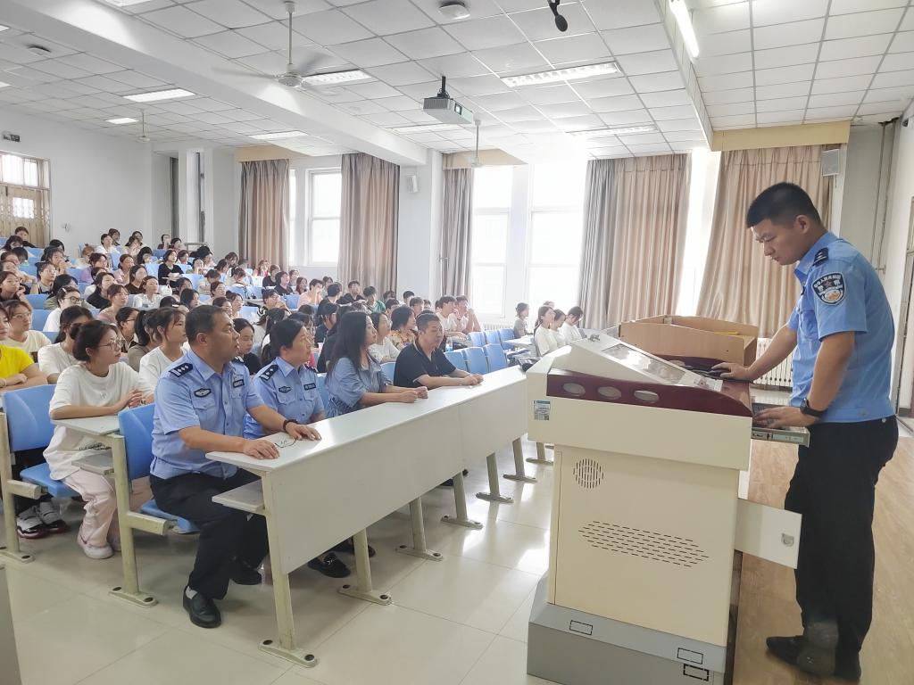 2023年9月9日上午,保卫处、外国语学院联合长安分局常宁路派出所走进校园,为新生开展安全教育讲座。本次讲座在博文楼C3教室举行。保卫处副处长上官涛、外国语学院党委书记高海燕、长安分局常宁路派出所民警刘洋、住校民警、新生辅导员与学生180余人参加。