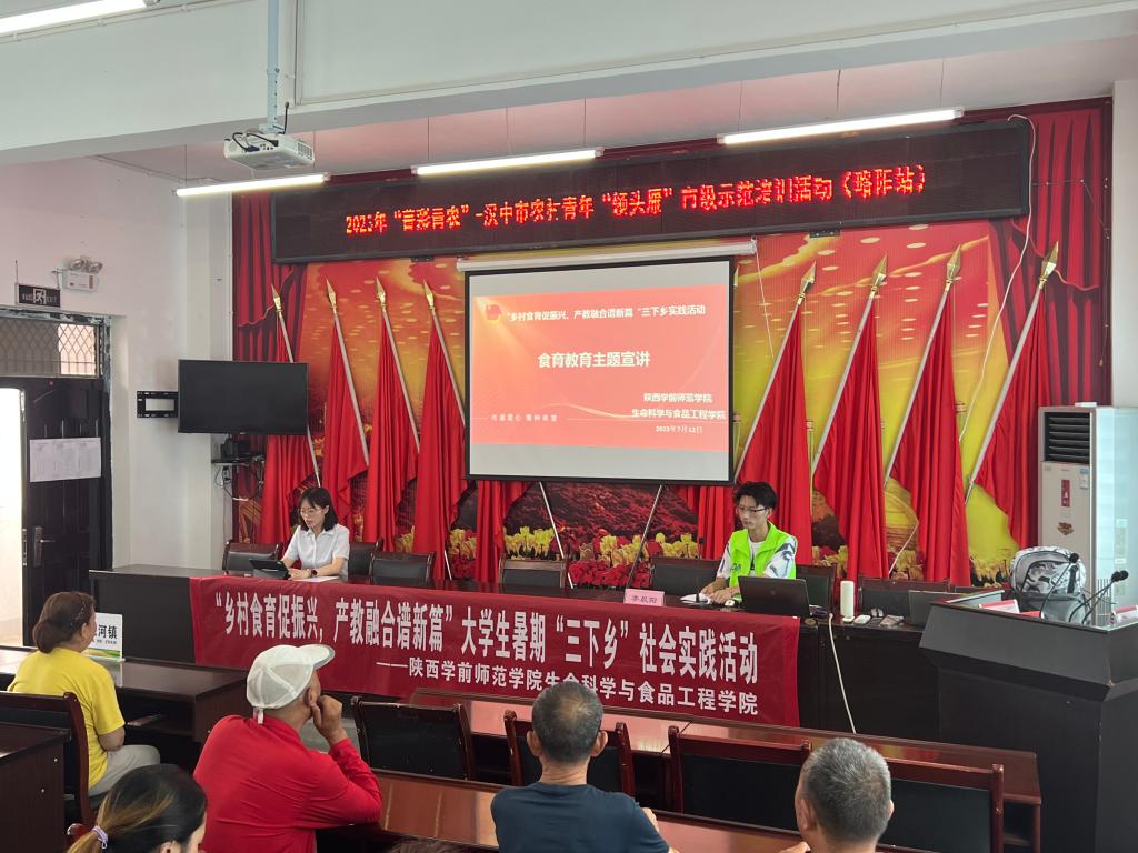 为深入贯彻习近平新时代中国特色社会主义思想,全面贯彻党的二十大精神,2023年7月12 日中午,生命科学与食品工程学院“乡村食育促振兴,产教融合谱新篇”“三下乡”实践队,在略阳县金家河镇政府开展食育教育讲座,实践队队员李晨阳面向60余位村民群众,通过现场授课及讲解,让村民们了解了食育的重要性,以及如何践行食育教育。本次活动由略阳县团县委、金家河镇团委和beat365正版唯一官网生命科学与食品工程学院实践队共同承办。