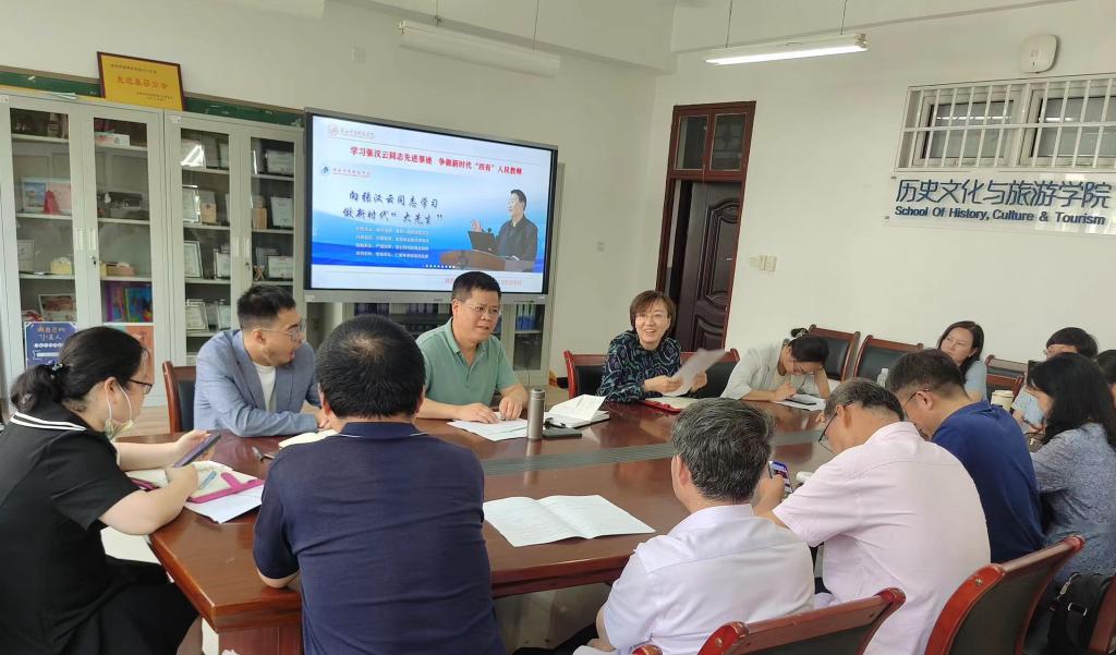 为学习宣传张汉云同志的先进事迹,激励教师爱岗敬业,向身边的榜样学习,不断提高思想政治素质,积极践行“四有”好老师标准,扎实推进师德师风建设,按照学校党委的部署要求,6月21日下午,历史文化与旅游学院在会议室开展“两代师表共同塑造”师德师风建设专题学习教育活动。学院全体教师参加会议,会议由学院党委书记童广运主持。
