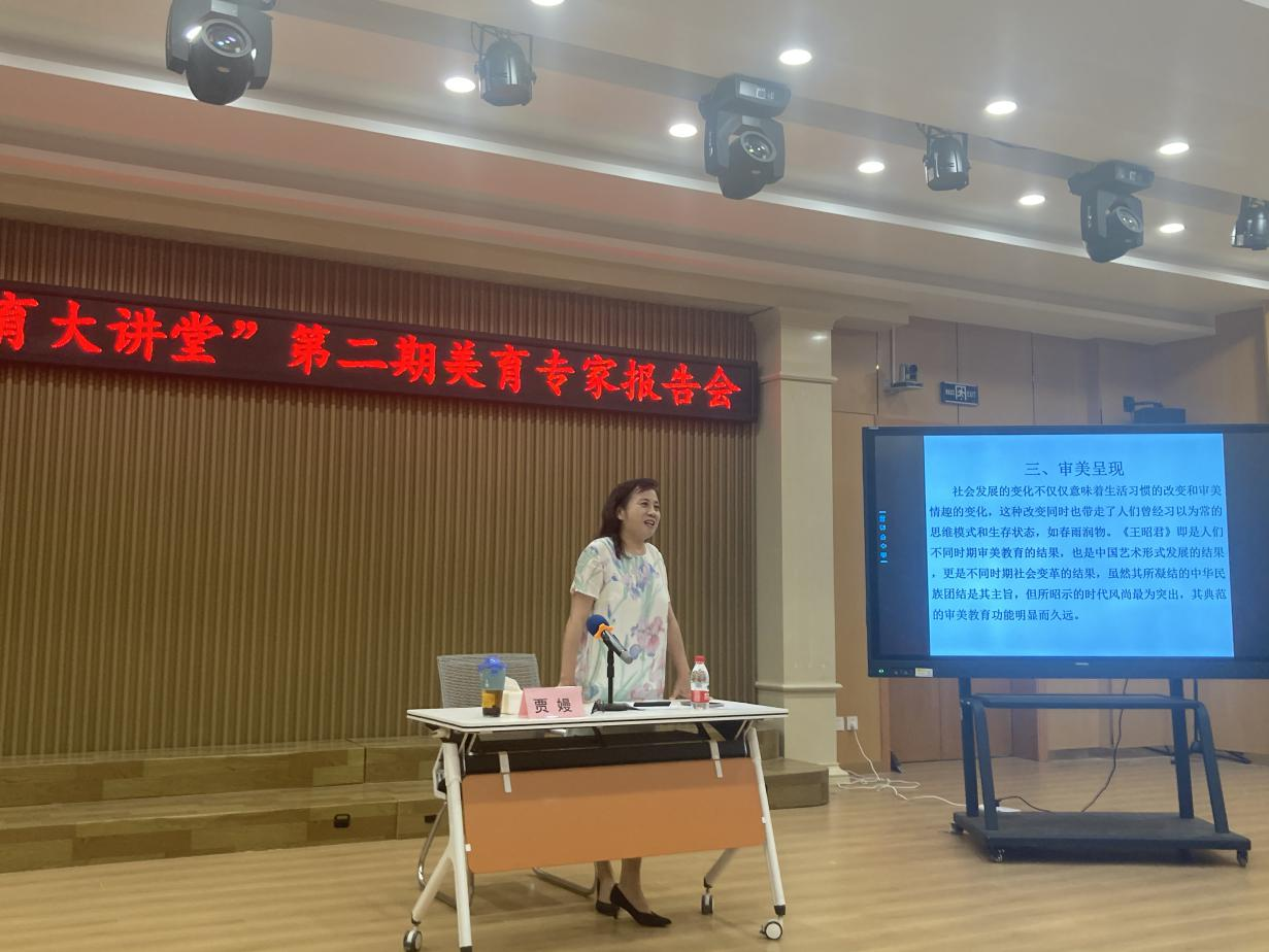 此次讲座特邀陕西师范大学音乐学院博士生导师,教育部学位中心评审专家,陕西二胡学会副会长贾嫚教授,为全校师生做专题报告,贾嫚教授曾代表陕西省政府、陕西师范大学出访美国、法国等十多个国家和地区。此次报告的主题是“审美教育与审美呈现”。讲座中,贾嫚教授对审美教育的概念以及培养方式进行了深度解读,强调高校作为教育的高地,应在人才培养中全过程贯穿美育。贾嫚教授在讲座中分析了审美教育是一种超越了个体功利性、实用性的直觉形式,但如实反映出人类社会生活的功利、实用的内涵,其情感因素贯穿其中。同时根据“王昭君事迹”与“马克思主义美育观”的讲解,对比中外审美教育的培养模式,阐释出中国传统审美呈现形式与其存在的价值和意义。