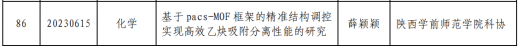 近日,陕西省科协发布了《关于2023年陕西省科协青年人才托举计划项目立项的通知》(陕科协发〔2023〕事企字8号),beat365化学化工学院薛颖颖博士申报的“基于pacs-MOF框架的精准结构调控实现高效乙炔吸附分离性能的研究”项目获批,项目编号:20230615。
