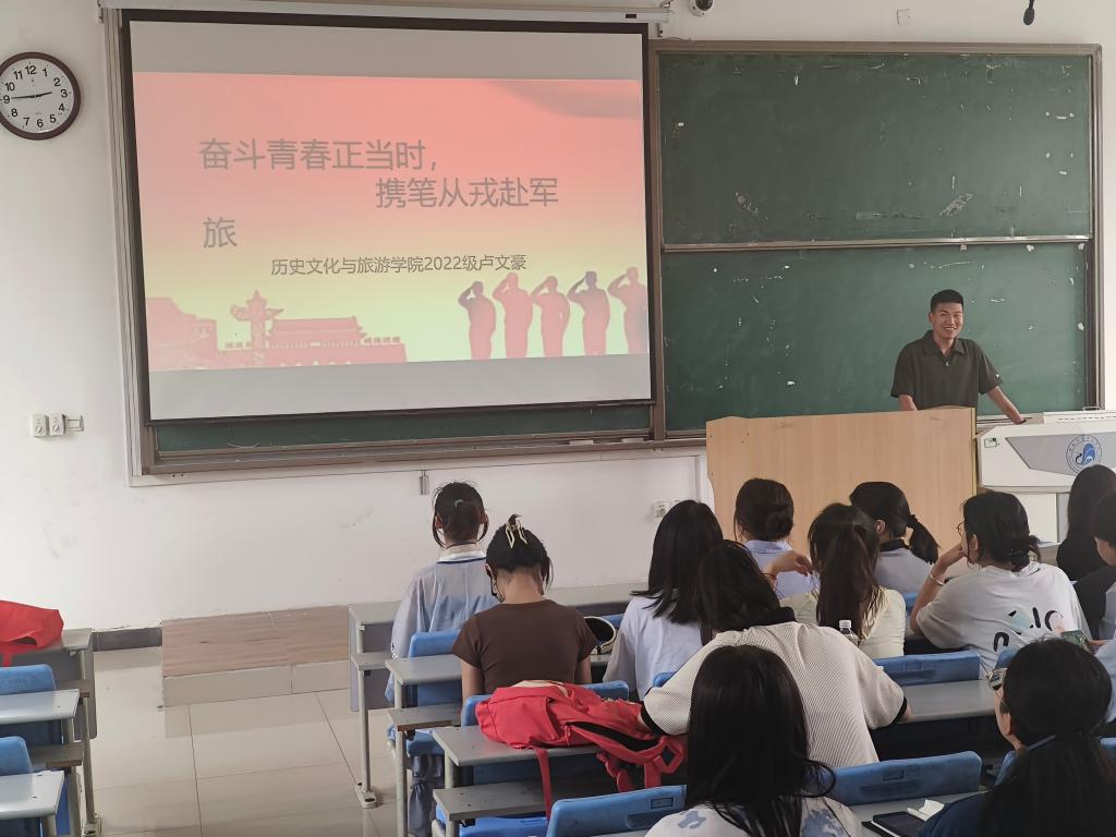 【历史文化与旅游学院】为进一步发挥优秀学生的示范和引领作用,教育和引导广大学生努力学习,奋发拼搏,树立理想信念,练就过硬本领,历史文化与旅游学院于近期集中开展了“身边的榜样”系列宣讲活动。宣讲人包括我院退役士兵,励志奖学金获得者,考研成功学生,从不同层面展现了我院优秀学生的风采。