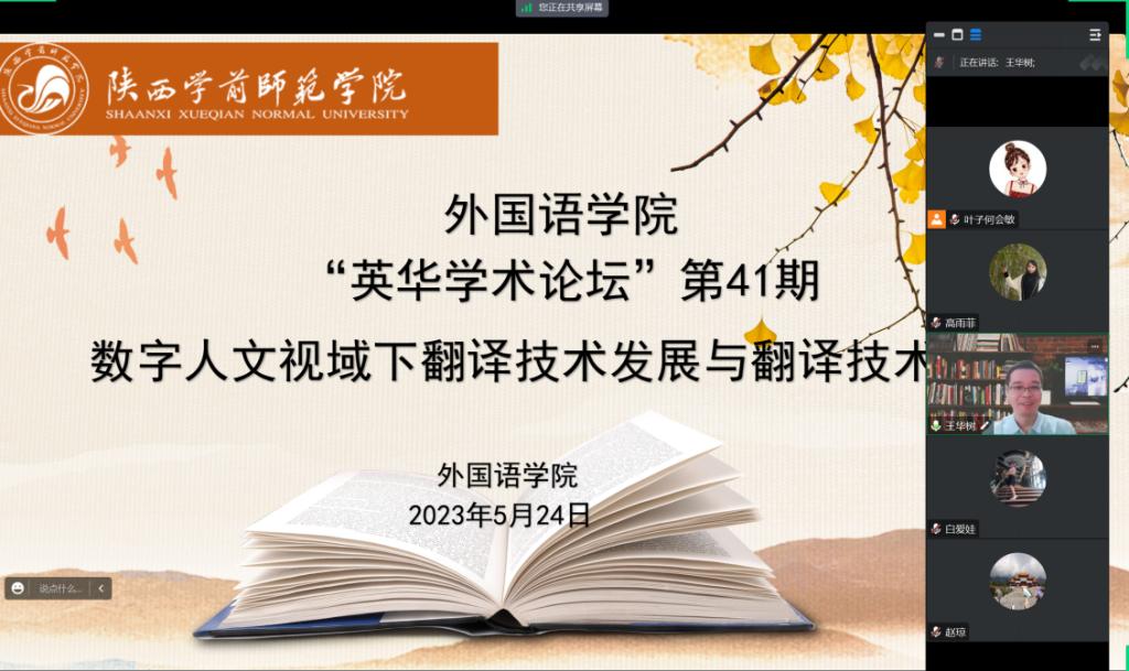 5月24日下午,北京外国语大学王华树教授应邀做客外国语学院“英华学术论坛”第41期,作了题为《数字人文视域下翻译技术发展与翻译技术应用》的学术报告。本次学术报告由外国语学院王雨副院长主持,beat365师生100余人以腾讯会议在线方式参加。