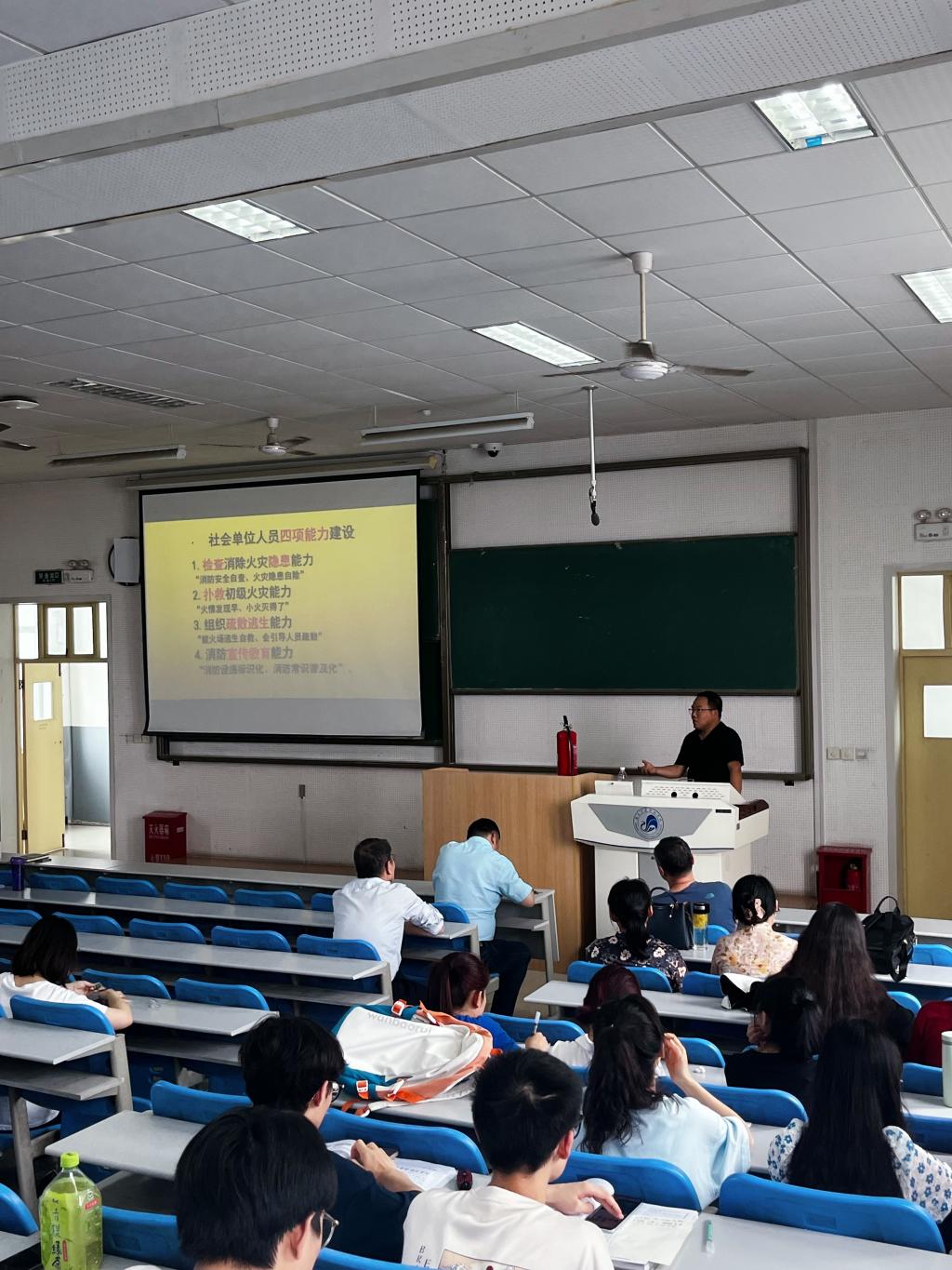 为进一步强化师生安全意识,提高防范自救能力,2023年5月18日下午14:00,生命科学与食品工程学院师生在积学楼C4阶梯教室参加了了“人人讲安全,个个会应急”消防安全培训。