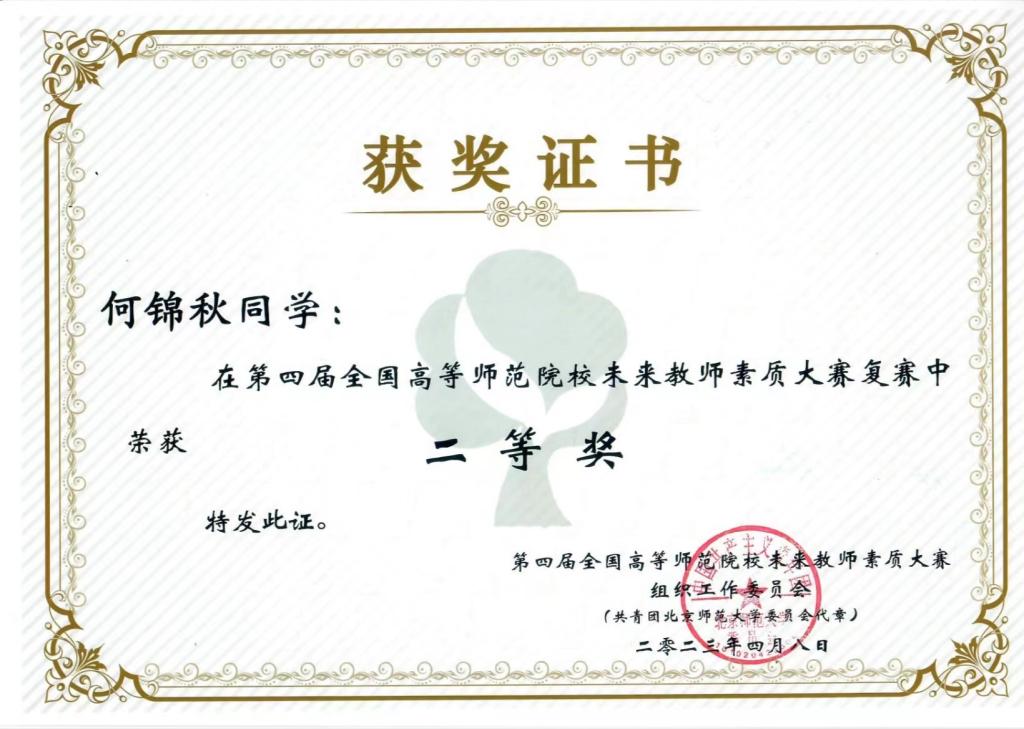 2023年4月8日,第四届全国高等师范院校未来教师素养大赛落下帷幕。历史文化与旅游学院何锦秋同学在大赛中获得“讲课二等奖”1项、“主题论文三等奖”1项的好成绩。本届比赛由北京师范大学团委联合多所国内高等师范院校团委主办,以“绽放新时代的师范荣光——学习贯彻党的二十大精神,争做‘四有’好老师”为主题。比赛自2022年11月启动,分为学校初赛、赛区复赛和全国决赛三个阶段。赛区复赛采用参赛者录制课堂视频、各赛区线上评审的形式开展。