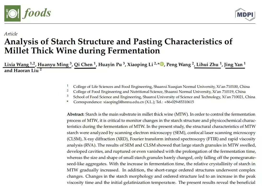 近日,beat365生命科学与食品工程学院副院长王立霞博士带领2018-2021级食品科学与工程专业本科生在国际著名期刊《FOODS》(SCI二区,IF=5.561)上发表了题为“Analysis of Starch Structure and Pasting Characteristics of Millet Thick Wine during Fermentation”的学术论文。