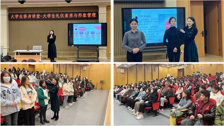 大学生礼仪素养和形象管理是新时代对人才的要求,也是大学生自身成长的要求和优良人格的基石。为进一步加强大学生文明素养,引导广大学生养成良好的礼仪规范,提升形象气质,营造积极向上的学风。音乐学院4月3日晚在大学生艺术教育中心举办大学生修身讲堂第四讲——“礼仪素养与形象管理”讲座。讲座中形协注册礼仪培训师、音乐学院冯佳妮老师主讲,2022级全体新生参加。讲座中形协注册礼仪培训师、音乐学院冯佳妮老师主讲,2022级全体新生参加。