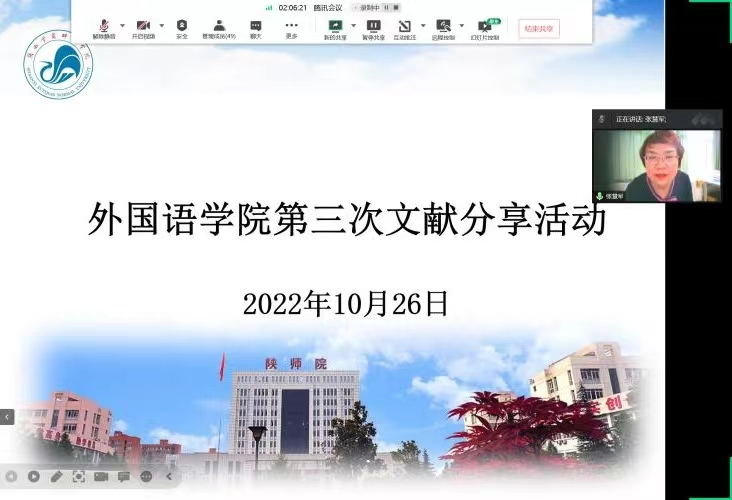 2022年10月26日下午,外国语学院举办了第三场文献分享活动。此次文献分享采取线上形式进行,我院全体教师、部分学生及来自校外同行参加,活动由副院长王雨主持。