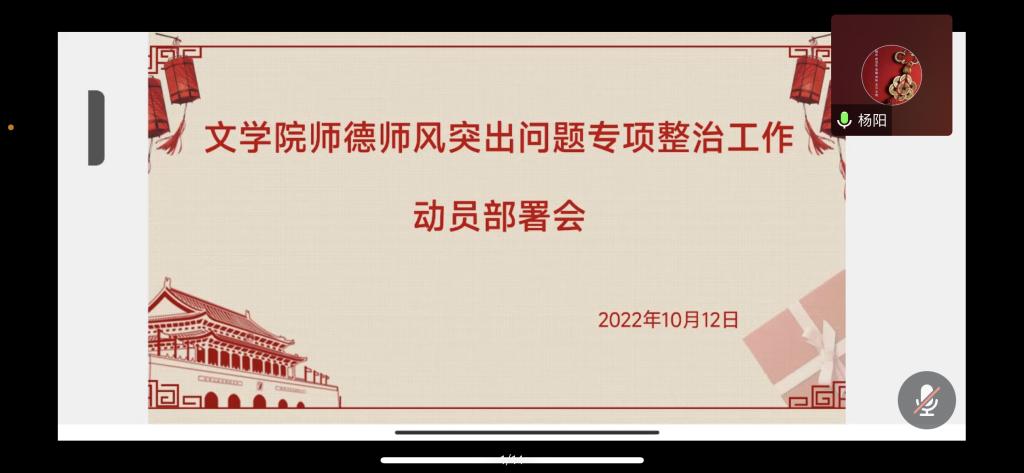 为进一步加强师德师风建设,提升教师队伍建设水平,营造良好育人生态,根据学校工作部署,结合学院工作实际和疫情防控需要,10月12日下午,文学院通过腾讯会议平台召开师德师风突出问题专项整治工作动员部署会。学院全体教职工参加会议,会议由学院党委书记杨阳主持。