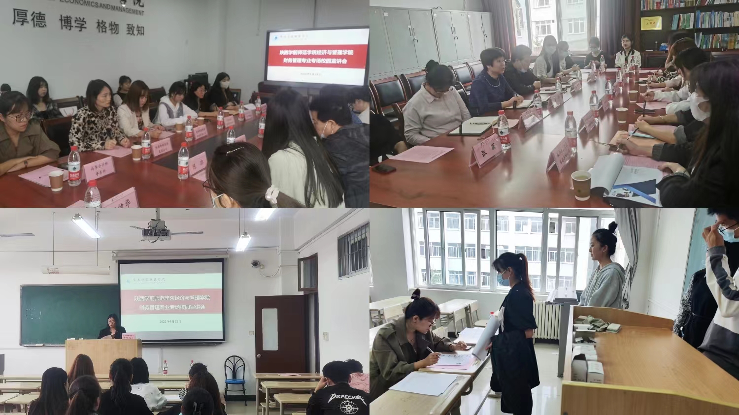 宣讲会开始前,经济与管理学院领导班子成员、财务管理专业教师代表与企业代表在博文楼B411会议室举行了见面会,双方就企业招聘岗位及条件、学生实习期间安全问题等事项进行了友好洽谈。随后与会企业通过PPT展示、面对面交流等方式在博文楼B501、B503、B504、B508教室分别向与会的毕业班学生介绍了企业概况、工作岗位需求以及薪资待遇等,帮助毕业班学生深入了解公司以及所属行业的招聘需求和发展方向。在宣讲环节结束后,相关企业收取了毕业生简历并进行了现场一对一面试。