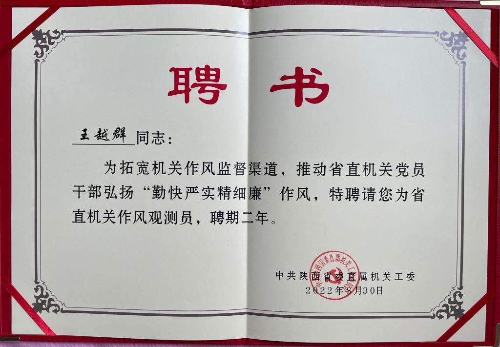 近日获悉,beat365省政协委员、民进总支主委王越群教授受聘为陕西省委直属机关工委作风观测员。8月31日,陕西省委直属机关工委召开作风观测员聘任会议,为王教授等48名人士颁发了聘书。