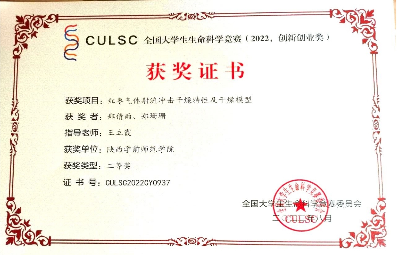 参赛作品《红枣气体射流冲击干燥特性及干燥模型》由我院王立霞老师指导,由食品科学与工程专业2018级郑倩雨同学和2019级郑珊珊同学共同参与完成。获奖作品对红枣气体射流冲击干燥动力学数学模型进行了较为系统的研究,并筛选出干燥过程的最优模型和最适干燥条件。气体射流冲击干燥作为一种新型干制技术,对红枣干制方法的丰富及干制效率的提高起到了积极作用。