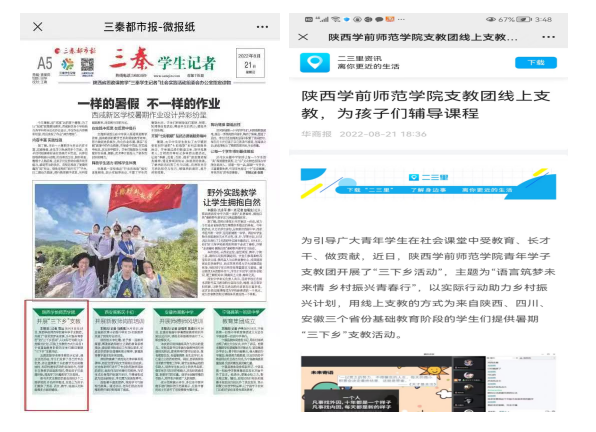 2022年8月,外国语学院开展了“语言筑梦未来情,乡村振兴青春行”的“三下乡活动”,以实际行动助力乡村振兴计划,用线上支教的方式为来自3个省份基础教育阶段的学生们提供暑期支教活动。本次活动取得了良好的社会影响力,先后被《三秦都市报》、《华商报》宣传报道。