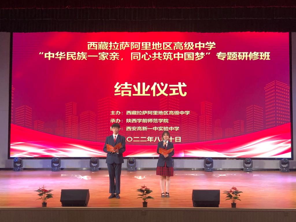 两校师生为大家献上丰富多彩的文艺节目。结业仪式前,西藏拉萨阿里地区高级中学师生参观了高新一中实验中学校园,学生们在高新一中实验中学老师的指导下进行了书法练习、歌唱练习、篮球技术切磋,并与高新一中实验中学学生开展了联谊活动。