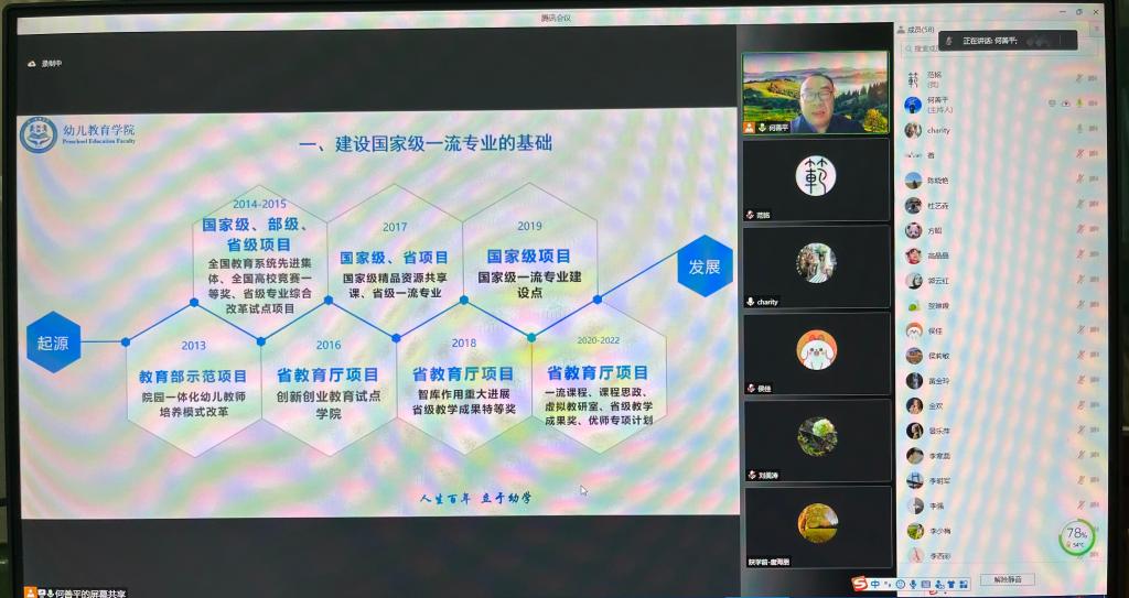 最后,何善平教师对专家们提出的宝贵意见和建议表示感谢,梳理并明确了专业未来发展的方向,同时,呼吁中国学前教育研究会、学前教指委,能够帮助学前教育国家级一流专业明确建设标准,为下一步专业验收工作的开展奠定扎实基础。