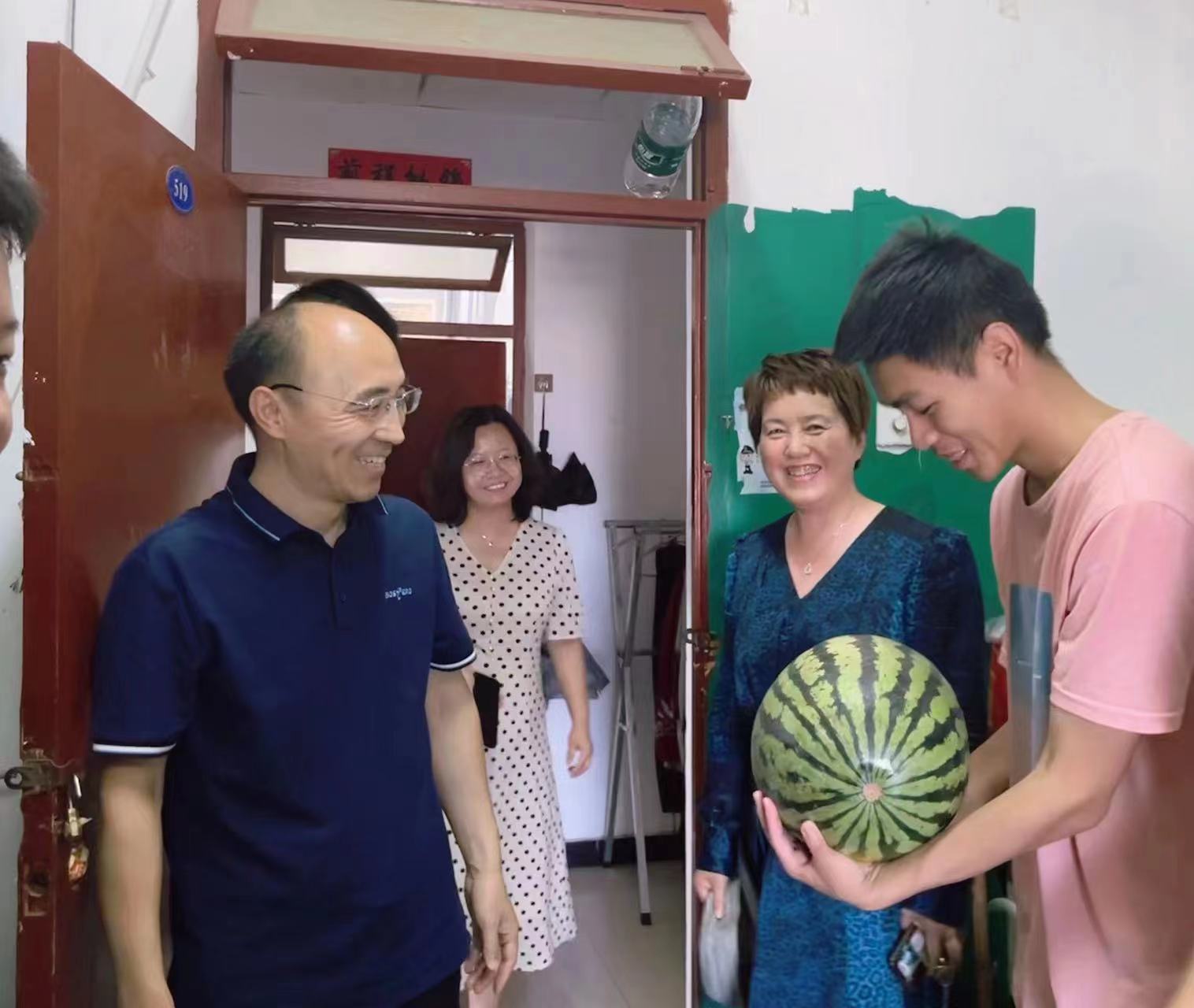 近期连续高温天气牵动着学校领导的心,为深入了解学生思想状态,提高广大学生的认同感和归属感,6月21日、22日连续两天校党委副书记权秋虎、马克思主义学院党委书记高萍、副书记白艳冒着酷暑前往宿舍看望学生,并为每位学生送去了清凉解暑的大西瓜。