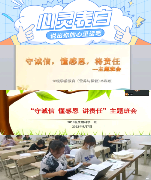 我院采取线上模式,活动主题为“心灵表白”,学生可在我院(陕师院生科院学工在线)公众号留言,通过此形式使学生从内心深处,树立诚信感恩意识,让学生明白,这个世上没有任何一份无缘无故的爱,别人对我付出爱和温暖时,学会感恩与诚信是一件像播种一样的事情,播下爱的种子定会在将来的某一天开出温暖的花。
