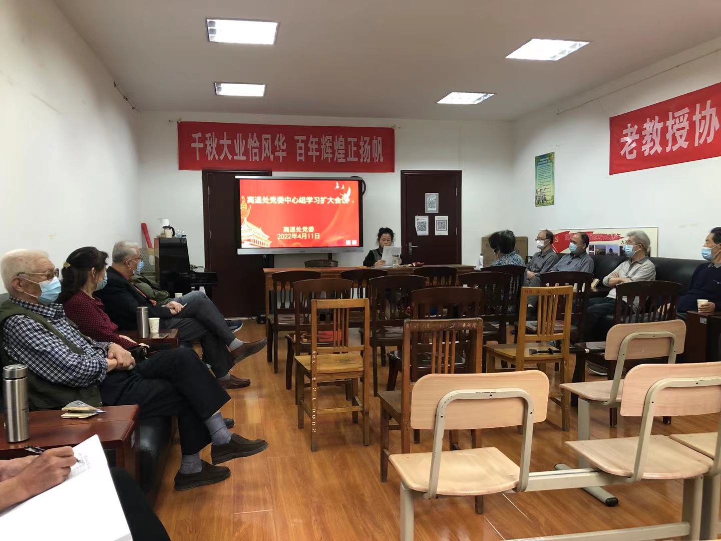 2022年4月11日下午,beat365离退休工作处党委在雁塔校区离退处老年会议室组织召开了校情通报会暨中心组扩大学习会议,离退处党委中心组成员、离休老同志和民主党派人士代表、部分退休校级领导、离退处党政班子以及工作人员共计16人参加了会议,会议由离退休工作处处长兼党委书记邸小燕同志主持。